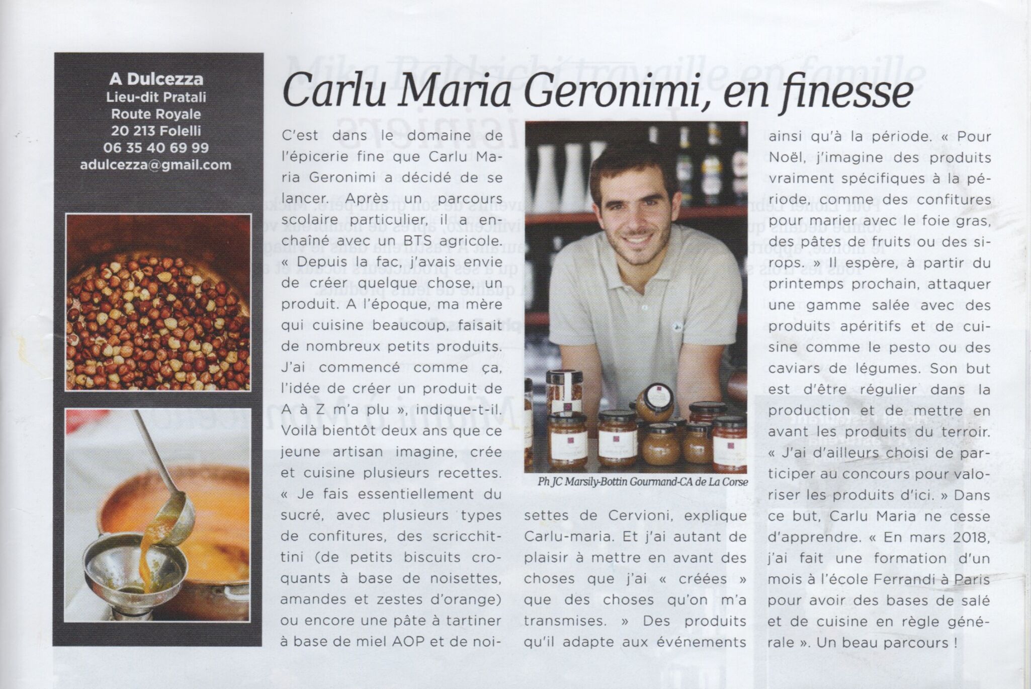 Après quelques expériences diverses et variées, c’est le goût de mon enfance qui a guidé mon projet professionnel en octobre 2016 : A Dulcezza . La richesse de notre terroir additionnée à celle de recettes familiales, m’ont donné l’envie de créer des produits corses destinés aux épiceries fines ,hôtels, restaurants, particuliers ect..